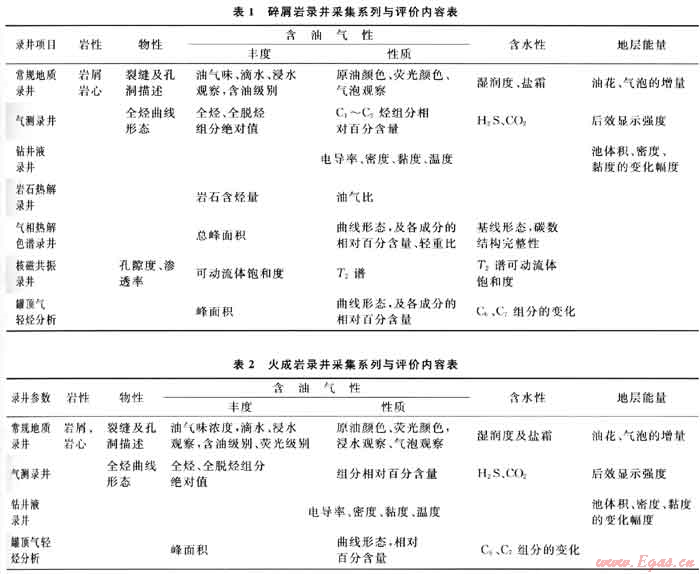 根據(jù)準噶爾盆地已發(fā)現(xiàn)的碎屑巖和火山巖天然氣藏儲層特性,分別建立了天然氣勘探的錄井采集系列與評價內容(表1、2)。