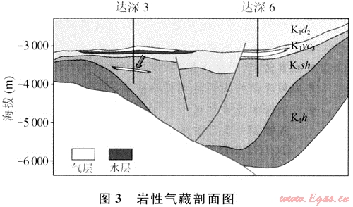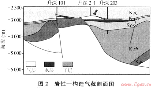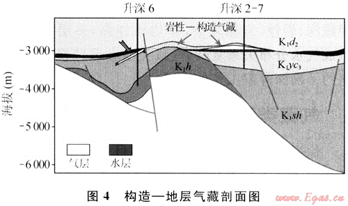 這種氣藏是在構造背景下,由于地層發(fā)生尖滅或被剝蝕后,上部致密地層超覆形成天然氣藏,通??煞譃槲挥诘貙硬徽厦嬉陨虾筒徽厦嬉韵聝煞N。這種氣藏類型主要發(fā)育在徐家圍子斷陷地層被剝蝕地區(qū),在目前已鉆探井中,僅有升深6井(沙河子組砂礫巖)揭示為這種氣藏類型(圖4)。該氣藏位于兩個向斜之間的構造高部位上,發(fā)育在營四段與沙河子組形成削蝕不整合面以下的沙河子組圈閉中。