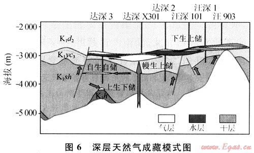 本區(qū)儲層發(fā)育、構造有利、生儲蓋組合良好匹配,具備形成大氣田的物質基礎??傮w上看,發(fā)育4種成藏模式:上生下儲式成藏模式(基巖風化殼氣藏和火石嶺組火山巖氣藏),自生自儲式成藏模式(沙河子組砂礫巖氣藏),下生上儲式成藏模式(營四段砂礫巖氣藏和營城組火山巖氣藏),幔生上儲成藏模式(各組段的二氧化碳氣藏L在以上4種成藏模式中的后3種模式相對發(fā)育,構成了徐家圍子斷陷的主要成藏模式,尤以下生上儲式成藏模式最為發(fā)育(圖6)。