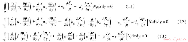 本文討論的是非穩(wěn)態(tài)的氣水滲流、氣氣擴(kuò)散問題,各參數(shù)不僅是空間域的函數(shù),而且是時間域的函數(shù),因此建立有限元方程時采用部分離散的方法[7]。對空間域的離散采用Galerkin有限元方法,對時間域的離散采用有限差分法,把型函數(shù)僅表示成空間坐標(biāo)的函數(shù),而節(jié)點的函數(shù)值則是時間t的函數(shù)。G表示一個有界的可度量幾何形體,在此表示積分區(qū)域。當(dāng)G為平面有界閉區(qū)域時,記為D;格林公式中,當(dāng)G為空間有限曲線段時,記為Γ。