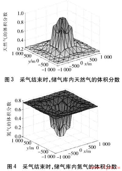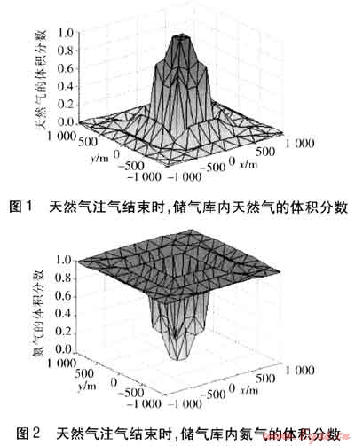 之后開始向儲氣庫注入天然氣,運(yùn)行到第116天時,累積注入量(10022400m3)約達(dá)到目標(biāo)注氣量,停止注氣。天然氣注入結(jié)束時,儲氣庫內(nèi)天然氣及氮?dú)獾捏w積分?jǐn)?shù)見圖1、2。由圖1、2可知,隨著天然氣的注入,天然氣逐漸將氮?dú)庀蛑車?qū)開,因而注采井周圍區(qū)域為純天然氣區(qū);由于氣體擴(kuò)散,天然氣與氮?dú)庀嗷交?,因而從注采井逐漸向外,天然氣的體積分?jǐn)?shù)逐漸減小,氮?dú)獾捏w積分?jǐn)?shù)逐漸增大,形成天然氣與氮?dú)獾幕旌蠋?;再逐漸向外,為純氮?dú)鈪^(qū)。