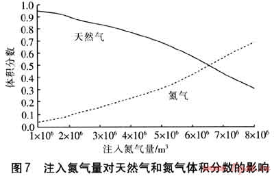 截至停止采氣時,儲氣庫剩余氣量為5875200m3,這部分氣體即為墊層氣,原儲氣庫的總氣量為10022400m3,則墊層氣量占總儲氣庫儲氣量的58.62%。而初始氮?dú)庾⑷肓繛?036800m3,則注入氮?dú)饬空級|層氣量的17.65%。