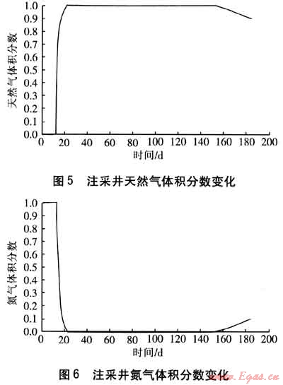 注氣結(jié)束后,關(guān)井穩(wěn)定20d,以使儲氣庫內(nèi)各點的壓力基本達(dá)到平衡狀態(tài),穩(wěn)定之后進(jìn)行回采。由于氣體相互擴(kuò)散,兩種氣體的混合帶逐漸變寬,隨著注采井壓力的下降,水會逐漸侵入。運(yùn)行到第184天時,注采井的含水飽和度超過0.5,認(rèn)為對回采不利,此時停止采氣,儲氣庫內(nèi)天然氣及氮?dú)獾捏w積分?jǐn)?shù)見圖3、4。