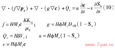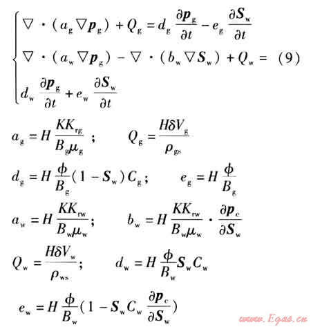 將氣水滲流連續(xù)性方程、運(yùn)動方程、氣體狀態(tài)方程、飽和度平衡方程以及毛管壓力方程整理后,得到氣水兩相滲流方程為:
