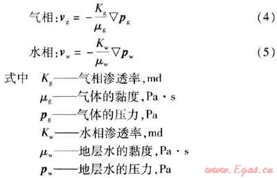 考慮氣水相流動時分別服從達(dá)西滲流定律,則有運(yùn)動方程: