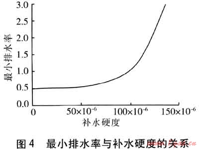 對(duì)蒸發(fā)冷卻系統(tǒng)而言,由于水不斷蒸發(fā),溶于水中的礦物質(zhì)會(huì)析出并沉積在濕簾表面上形成水垢。濕簾表面大量的水垢會(huì)影響濕簾的蒸發(fā)冷卻效率和使用壽命。目前,在燃?xì)廨啓C(jī)進(jìn)氣冷卻系統(tǒng)中,一般針對(duì)不同的補(bǔ)水硬度(以CaC03計(jì),質(zhì)量分?jǐn)?shù))通過(guò)控制排水率(即排水質(zhì)量與蒸發(fā)水質(zhì)量之比)的方法來(lái)抑制水垢的產(chǎn)生。最小排水率通常采用圖4的曲線(xiàn)來(lái)確定[3]。