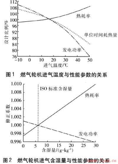 PG6111FA型燃?xì)廨啓C(jī)發(fā)電機(jī)組的標(biāo)準(zhǔn)工況(額定工況)為:環(huán)境溫度為15℃,大氣絕對(duì)壓力為97.8kPa、相對(duì)濕度為48%(即含濕量為5.25g/kg)。在標(biāo)準(zhǔn)工況下,該燃?xì)廨啓C(jī)發(fā)電功率為73640kW,單位時(shí)間耗熱量為750.4×106kJ/h,熱耗率(指每生產(chǎn)1kW·h電所消耗的熱量)為10190kJ/(kW·h),排氣質(zhì)量流量為735.3×103kg/h,排氣溫度為600.6℃,燃料是天然氣。在非標(biāo)準(zhǔn)工況下(環(huán)境相對(duì)濕度為48%,大氣絕對(duì)壓力為97.8kPa),燃?xì)廨啓C(jī)進(jìn)氣溫度與性能參數(shù)的關(guān)系見(jiàn)圖1,圖1中設(shè)計(jì)比例是指燃?xì)廨啓C(jī)非標(biāo)準(zhǔn)工況下的性能參數(shù)與標(biāo)準(zhǔn)工況下的性能參數(shù)之比。在環(huán)境溫度為15℃、大氣壓力為97.8kPa時(shí),燃?xì)廨啓C(jī)空氣進(jìn)氣含濕量與性能參數(shù)的關(guān)系見(jiàn)圖2,圖2中含濕量是每1kg干空氣中含有水的質(zhì)量,修正系數(shù)是指非IS0標(biāo)準(zhǔn)空氣進(jìn)氣含濕量時(shí)燃?xì)廨啓C(jī)的性能參數(shù)與IS0標(biāo)準(zhǔn)空氣進(jìn)氣含濕量下燃?xì)廨啓C(jī)的性能參數(shù)之比。
