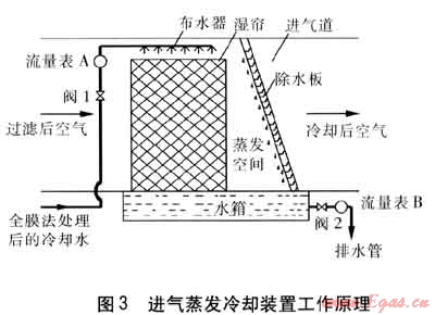進(jìn)氣蒸發(fā)冷卻裝置工作原理見(jiàn)圖3。它由濕簾、布水器、除水板、水箱及一些附屬設(shè)備組成。其工作原理是:經(jīng)全膜法處理后的冷卻水經(jīng)閥1調(diào)節(jié)送至濕簾頂部的布水器后均勻地灑在濕簾表面,由于重力作用冷卻水自上往下如水簾灑下??諝馐紫冉?jīng)過(guò)濾器過(guò)濾,除去雜質(zhì),然后再進(jìn)入蒸發(fā)冷卻裝置,與濕簾中自上而下的冷卻水進(jìn)行熱濕交換。部分水因吸收空氣的顯熱汽化蒸發(fā)后變成水蒸氣,未蒸發(fā)的水流回水箱,排出后用于其他用途??諝庖蚴ワ@熱而溫度降低,同時(shí)因融進(jìn)了部分水蒸氣而使其相對(duì)濕度增加。空氣與水蒸氣的混合物流向下游的除水板,其中的小水滴和部分水霧在除水板上凝結(jié)成大水滴,并在重力的作用下落入水箱,降低了進(jìn)氣的攜水率,減少了壓氣機(jī)因進(jìn)氣空氣水量增加而導(dǎo)致的負(fù)荷消耗;同時(shí)空氣中的微小塵埃也隨水滴落入水箱,淋灑下來(lái)的冷卻水對(duì)空氣還起到了水洗除塵的輔助效果,避免了進(jìn)氣中的微量雜質(zhì)對(duì)燃?xì)廨啓C(jī)葉片的腐蝕。