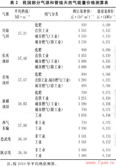 統(tǒng)一全國油氣田天然氣熱值單價,然后根據(jù)各油氣田天然氣熱值計算天然氣的能量價格,天然氣的計價單位為元/kWh。假定2010年全國天然氣平均發(fā)熱量為36.20MJ/m3,天然氣出廠價平均為0.804元/m3,測算的統(tǒng)一熱值單價為0.080元/kWh。