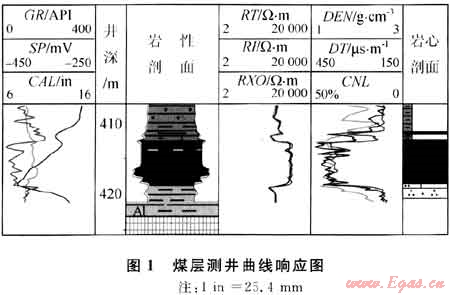 由于煤巖所具有的特殊屬性,煤層的測井響應(yīng)很特殊,比圍巖較易識別,具體表現(xiàn)為“三高兩低”的特征,即:高電阻、高聲波時(shí)差、高中子、低伽馬、低體積密度(圖1)。
