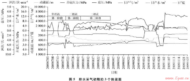 根據(jù)韓城地區(qū)的實(shí)際條件,經(jīng)過不斷摸索,制訂出適合于韓城地區(qū)的一套排采制度:①在排采初期第一階段,低排采強(qiáng)度持續(xù)10~15d,使地層重新建立壓力場平衡,掌握地層的供液能力;②在第二階段,井底流壓接近煤層臨界解吸壓力,這是排采初期的關(guān)鍵時(shí)刻,應(yīng)適當(dāng)加大排采強(qiáng)度,盡可能地將近井地帶的煤粉和壓裂過程中形成的遠(yuǎn)端煤粉排出,疏通近井地帶的高滲流通道;③第三階段主要是氣、液兩相滲透率反復(fù)變更階段(圖5),排采時(shí)應(yīng)保持液面的平穩(wěn)下降,不能造成壓力激動而打破地下重新形成的壓力場,導(dǎo)致遠(yuǎn)端滲流通道閉合,滲透率降低,這一過程一般持續(xù)時(shí)間達(dá)一個(gè)月。