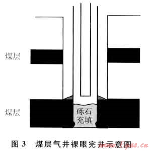 裸眼完井(圖3)是指將套管下在生產(chǎn)段煤層頂,然后鉆開煤層,不進(jìn)行壓裂等增產(chǎn)措施,產(chǎn)氣煤層保持裸眼或用礫石充填。裸眼完井是一種最基本、最簡單、費(fèi)用最低的完井方式,適合于埋深較淺、滲透性能好的單目的層,煤儲層穩(wěn)定且不容易垮塌。