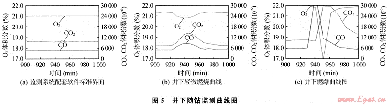 井下隨鉆監(jiān)測(cè)系統(tǒng)是專門為監(jiān)測(cè)井下燃爆現(xiàn)象而開發(fā)研制的。目前,在現(xiàn)場(chǎng)使用比較成熟的是西南石油大學(xué)研制的UBD氣體監(jiān)測(cè)系統(tǒng),其主要原理是在監(jiān)測(cè)到烴類氣體的情況下,通過(guò)對(duì)返出氣體中O2、CO2、和CO體積分?jǐn)?shù)變化的監(jiān)測(cè)來(lái)判斷井下是否發(fā)生燃爆。一旦發(fā)生井下燃爆,由于井下燃燒為不完全燃燒,返出氣體中的CO2、CO氣體體積分?jǐn)?shù)會(huì)升高,而O2氣體體積分?jǐn)?shù)會(huì)降低。圖5是3種情況下監(jiān)測(cè)界面圖的對(duì)比[2]。