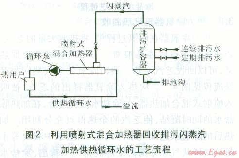 利用噴射式混合加熱器回收排污閃蒸汽,加熱供熱循環(huán)水,工藝流程見圖2。鍋爐的排污水進人排污擴容器后,由于壓力降低,產生閃蒸汽,將閃蒸汽引入噴射式混合加熱器,加熱供熱循環(huán)水。