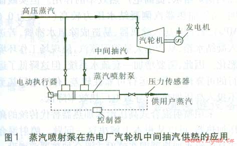 在工業(yè)生產過程中,不同的工藝過程往往需要不同壓力的蒸汽,而熱電廠、鍋爐房供應的蒸汽壓力通常比較單一。傳統(tǒng)方法是通過蒸汽的減溫減壓,滿足熱用戶對蒸汽參數(shù)的要求。但是,這種方式易造成蒸汽品位的降低。蒸汽壓力匹配技術就是為滿足熱用戶對蒸汽不同壓力等級需求而開發(fā)的技術,它在實現(xiàn)節(jié)能的同時合理利用蒸汽裕壓,通過蒸汽噴射泵利用高壓蒸汽引射低壓蒸汽,在降低高壓蒸汽壓力的同時提高低壓蒸汽的壓力。通過設備的結構設計和蒸汽流量調節(jié),產生介于高、低壓蒸汽壓力之間的各種壓力的蒸汽,滿足用戶的要求。蒸汽噴射泵在熱電廠汽輪機中間抽汽供熱的應用見圖l。鍋爐供應的高壓蒸汽進入蒸汽噴射泵,通過引射作用,將汽輪機中間抽汽(低壓蒸汽)吸人蒸汽噴射泵,最后向用戶供應一定壓力的蒸汽。由壓力傳感器、控制器、電動執(zhí)行器組成的自動控制系統(tǒng),通過測量蒸汽噴射泵出口蒸汽壓力的變化,調節(jié)進入蒸汽噴射泵的高壓蒸汽流量,保持蒸汽噴射泵出口蒸汽壓力的穩(wěn)定,滿足用戶對蒸汽壓力的需要。
