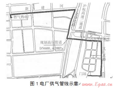 由于城市門站直線距離電廠不足3kin,管線距離僅4.5km,為此電廠所需天然氣從市門站接出,并用專線直供電廠??紤]到電廠二期擴建及減少啟停和事故狀態(tài)下對天然氣管網(wǎng)的沖擊,管徑選擇為DN600。但是目前的城市門站只能滿足電廠一期工程的需要,為此一期供氣工程利用現(xiàn)狀高壓系統(tǒng),在現(xiàn)狀進站總管設置三通后,經(jīng)計量(成撬設置)后直供電廠。同