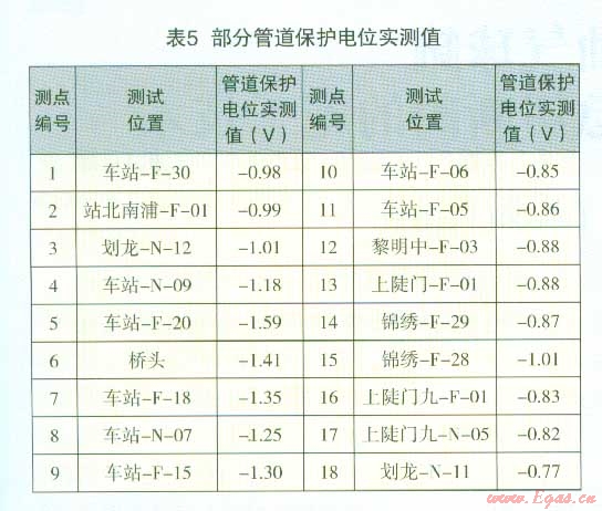 區(qū)域二兩座深井陽極安裝后,對管網(wǎng)進行了-段時間的極化,各測試點保護電位測試結(jié)果見表5,大多數(shù)檢測點的電位在-0.85V至-l.5V之間,達到了保護電位,但也有小部分電位在-0.85V以卜達不到保護電位,個別在-1.5v以下,管網(wǎng)處于過保護狀態(tài)。