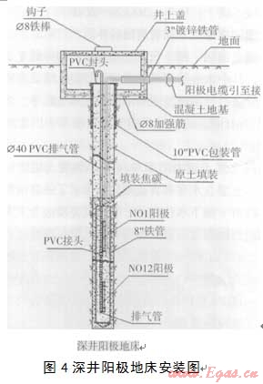 公司于2011年3月苗‘先啟動了Ⅸ域二的深井陽極電流保護工程。經(jīng)計算管道保護面積為19 631m2,設(shè)計保護電流密度為lomA/m2,保護總電流為196A,在南浦氣化站和位于車站大道的公用集團內(nèi)各設(shè)置1座深井陽極陰極保護站。每個站內(nèi)設(shè)l00A/100V恒電位儀2臺,-開-備。在站內(nèi)距離管線50m~100m的低洼潮濕、土層較厚處鉆建直立式陽極地床,升深60m,井內(nèi)裝分段預(yù)制型陽極體7組,規(guī)格為Ф325×6 000,內(nèi)裝Ф75×1 500高硅鑄鐵陽極3支。將高硅鑄鐵陽極、高性能碳素填料,PVC排氣管,部分陽極引線電纜,井套管組合裝配為-體,便于運輸和安裝,并可保證裝配精度和質(zhì)量(圖4)。每500m左有設(shè)置-個測試樁或在原有閥門井內(nèi)設(shè)置測試點。對于平行或跨越管道按-定間距或在最接近處作均壓處理,使電位分布均衡。