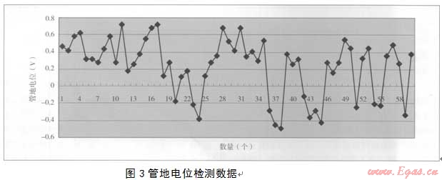 對整體管道的自然電位測試和原犧牲陽極保護系統(tǒng)進行測試,大部分管道處在自然腐蝕電位狀態(tài)(-0.45V,Cu/CuS04參比電極),所測的60處管地電位在-0.49V~-0.72V之間波動(見圖3),其中正值占77%,最負值-0.49V,達不到管道陰極保護電位(即管/地界面極化電位)要求的-0.85V,即管道運行沒有處于陰極保護狀態(tài)。
