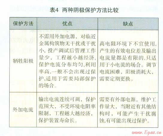 陰極保護是給被保護物體通以陰極電流,使之陰極極化減小或防止金屬腐蝕的方法,主要有犧牲陽極法和外加電流法(也稱強制電流法)兩種,兩者比較如表4。