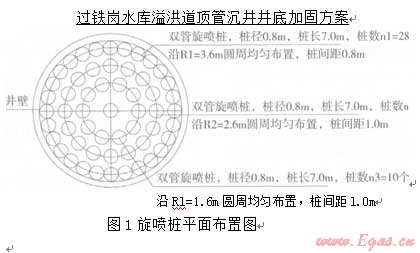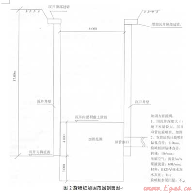 要加同沉井內(nèi)虛土,首先想到的是旋噴樁。眾所周知,旋噴樁是一種適合于加固軟土的很好地基處理方法,但其施工一般是在地面上進(jìn)行。旋噴樁若要在深度達(dá)l7m、而其中上部還要架空約13m的沉井內(nèi)施工卻是從未曾有人嘗試過。旋噴樁施工隊(duì)伍也擔(dān)心架空l3m可能無法施工、加固效果很難保證。經(jīng)過仔細(xì)分析,我們大膽提出,只要采取的措施得法,旋噴樁是可以用于加固沉井內(nèi)虛土并起到止水作用的。通過現(xiàn)場(chǎng)指導(dǎo)施工,落實(shí)各項(xiàng)施工措施,最終證明,旋噴樁加固效果良好,虛土加同后,井底未出現(xiàn)涌砂、涌土現(xiàn)象,順利清除了井底虛土,保證了沉井順利封底。見圖l、圖2。