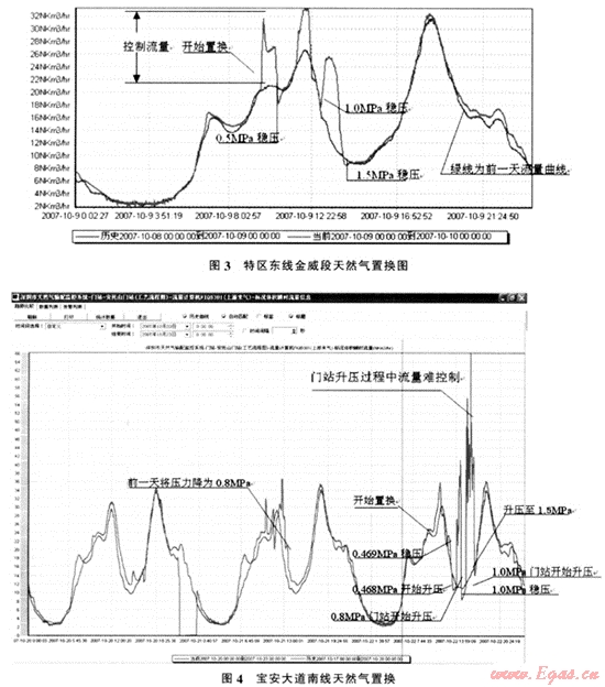 (3) 按有關(guān)規(guī)范的要求,置換時(shí)的流速應(yīng)控制在5m/s。通過(guò)粗略計(jì)算將流速控制折算成流量控制,建立流量控制表,通過(guò)SCADA系統(tǒng)門站瞬時(shí)流量,結(jié)合前一天的流量曲線,算出增量,將增量與流量控制表對(duì)比,及時(shí)通知現(xiàn)場(chǎng)進(jìn)氣閥門操作人員進(jìn)行調(diào)整。將流量控制在規(guī)范范圍。同時(shí)也保證了流量較為平穩(wěn),將對(duì)上游的影響降到最低。