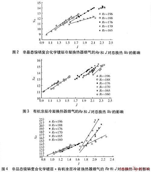 非晶態(tài)鎳磷復(fù)合化學(xué)鍍層冷凝換熱器煙氣的Re和J,對(duì)總換熱Nu的影響見(jiàn)圖2,有機(jī)涂層冷凝換熱器煙氣的Re和J對(duì)總換熱Nu的影響見(jiàn)圖3,非晶態(tài)鎳磷復(fù)合化學(xué)鍍層+有機(jī)涂層冷凝換熱器煙氣的Re和J對(duì)總換熱№的影響見(jiàn)圖4。