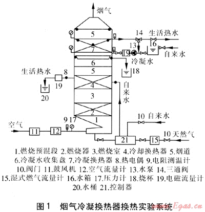 本實(shí)驗(yàn)臺(tái)是在普通燃?xì)鉄崴魃霞友b冷凝換熱器而成。實(shí)驗(yàn)系統(tǒng)由3部分組成:氣(包括天然氣、空氣、煙氣)系統(tǒng)、水系統(tǒng)和控制系統(tǒng)。實(shí)驗(yàn)系統(tǒng)見(jiàn)圖1。