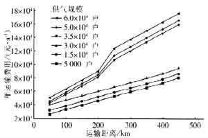 ②年運(yùn)輸費(fèi)用隨運(yùn)輸距離線性變化,當(dāng)供氣規(guī)模在3×1O4戶以下時(shí),斜率較??;當(dāng)供氣規(guī)模在3.5×104戶以上時(shí),斜率較大,且在200 km和250km之間有一轉(zhuǎn)折。斜率差異主要是因?yàn)槟壳癓NG汽車槽車型號(hào)少(國內(nèi)常用的LNG槽車容積主要為30 m3、40m3和45 m3),3×104戶以下供氣規(guī)模的氣化站每天所需的用氣量,單輛槽車每天運(yùn)輸一次即能滿足。供氣規(guī)模超過3×104戶后,單輛槽車每天運(yùn)輸2次或2輛槽車每天各運(yùn)輸一次才能滿足氣化站每天所需的用氣量。出現(xiàn)轉(zhuǎn)折主要是因?yàn)榻_^程中考慮到運(yùn)輸安全性,規(guī)定槽車的行駛速度為70 km/h且單輛槽車每天在路上行駛的時(shí)間不超過13 h,因此當(dāng)運(yùn)輸距離超過200km后,氣化站每天所需的用氣量由原先的單輛槽車每天運(yùn)輸2次來滿足變?yōu)?輛槽車每天各運(yùn)一次來滿足,從而年運(yùn)輸費(fèi)用中的槽車年折舊費(fèi)用、保險(xiǎn)費(fèi)用等增加。