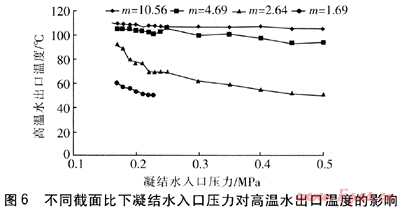 不同截面比下凝結(jié)水入口壓力對(duì)高溫水出口溫度的影響見圖6。高溫水出口溫度取決于引射蒸汽量和凝結(jié)水流量,是考察引射混合式低壓加熱器加熱性能的重要指標(biāo)之一。由圖6可知,隨著截面比的改變,高溫水出口溫度變化較大。當(dāng)截面比m=1.69時(shí),高溫水出口溫度比其他3組試驗(yàn)值低。由圖4、5可知,在4組試驗(yàn)數(shù)據(jù)中,截面比m=1.69時(shí)的凝結(jié)水流量最大、引射蒸汽量最高,但增大的引射蒸汽量不足以抵消凝結(jié)水流量增大的影響,因此高溫水出口溫度最低。高溫水出口溫度最高的是截面比m=10.56的引射混合式低壓加熱器,高溫水出口溫度可達(dá)110℃。由此可知,對(duì)于引射混合式低壓加熱器性能的考察要全面,不能只關(guān)注引射蒸汽量,應(yīng)綜合考察其加熱性能,選擇合適的截面比,這樣才能獲得較高溫度的高溫水。