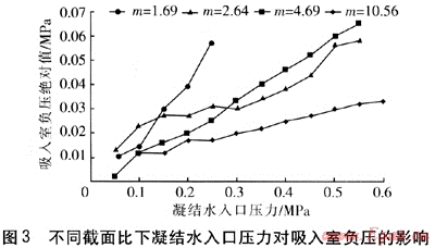 引射能力指引射混合式低壓加熱器對(duì)被引射蒸汽引射作用的強(qiáng)弱,吸入室負(fù)壓決定引射混合式低壓加熱器對(duì)蒸汽的引射能力,測(cè)試在不打開蒸汽閥門的條件下進(jìn)行。不同截面比下凝結(jié)水入口壓力對(duì)吸入室負(fù)壓的影響見圖3。由圖3可知,吸入室負(fù)壓與凝結(jié)水入口壓力、截面比的關(guān)系密切。隨著凝結(jié)水入口壓力的增大,吸入室負(fù)壓在不斷增大。截面比m=4.69、凝結(jié)水入口壓力為0.55MPa時(shí),吸入室負(fù)壓可達(dá)到0.065MPa。由試驗(yàn)數(shù)據(jù)可知,吸入室負(fù)壓能夠有效消除凝結(jié)水沿汽輪機(jī)抽氣管道回流的壓力,伴隨著運(yùn)行工況的變化,吸入室負(fù)壓也會(huì)隨之改變,但是負(fù)壓一直存在,并對(duì)凝結(jié)水回流產(chǎn)生抑制作用,避免汽輪機(jī)發(fā)生事故。