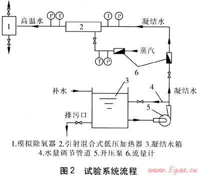 試驗(yàn)?zāi)M小型火電廠裝機(jī)容量為6MW的發(fā)電機(jī)組低壓加熱器的工況,被引射蒸汽壓力為0.18~0.20MPa,試驗(yàn)過程中調(diào)節(jié)凝結(jié)水入口壓力,變化范圍為0.04~0.60MPa。試驗(yàn)系統(tǒng)流程見圖2,溫度、壓力采集點(diǎn)緊鄰引射混合式低壓加熱器進(jìn)出口,確保采集結(jié)果接近實(shí)際。試驗(yàn)過程中溫度、壓力采用人工記錄與模塊化數(shù)據(jù)采集兩種方式。