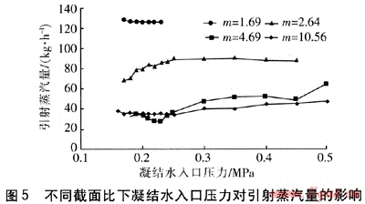 ② 相同凝結(jié)水入口壓力下,不同截面比的引射混合式低壓加熱器引射蒸汽量不同。截面比小的,工作噴嘴出口直徑大,凝結(jié)水流量也大,產(chǎn)生的負(fù)壓及引射蒸汽量也大。