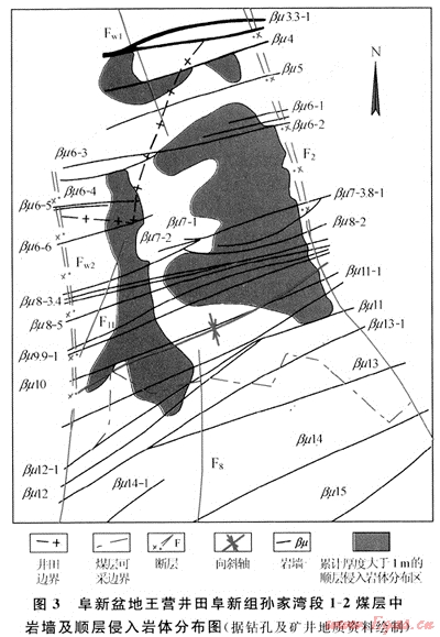 王營(yíng)井田地處阜新盆地(屬晚中生代盆地)中部,位于軸線呈北東東向王營(yíng)向斜被北北西走向的F2、FW2斷層所夾的地塹狀斷塊內(nèi)。經(jīng)多次活動(dòng)且斷層泥發(fā)育的F2、FW2斷層分別構(gòu)成井田的東、西邊界,北界大體位于βμ3巖墻一線,南界為煤層可采邊界。該井田含煤巖系為下白堊統(tǒng)阜新組,煤種以長(zhǎng)焰煤為主,煤層氣成藏條件較好,煤層氣藏的成因類型屬水動(dòng)力封閉-復(fù)合圈閉煤層氣藏。該區(qū)是我國(guó)煤層氣早期開發(fā)選區(qū)之一,也是我國(guó)首例在礦井中發(fā)現(xiàn)、研究和進(jìn)行商業(yè)開發(fā)的煤層氣田之一。生產(chǎn)礦井為煤層氣富集地質(zhì)因素的深入研究提供了方便條件。