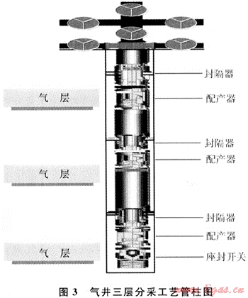 生產(chǎn)管柱主要由伸縮器+配產(chǎn)器+Y341封隔器+伸縮器+配產(chǎn)器+Y341封隔器+配產(chǎn)器+死堵組成,通過(guò)投撈氣嘴可調(diào)配各產(chǎn)層的氣量,分層測(cè)試可由電纜或地面投撈方式完成[2],三層分采工藝管柱圖如圖3所示。