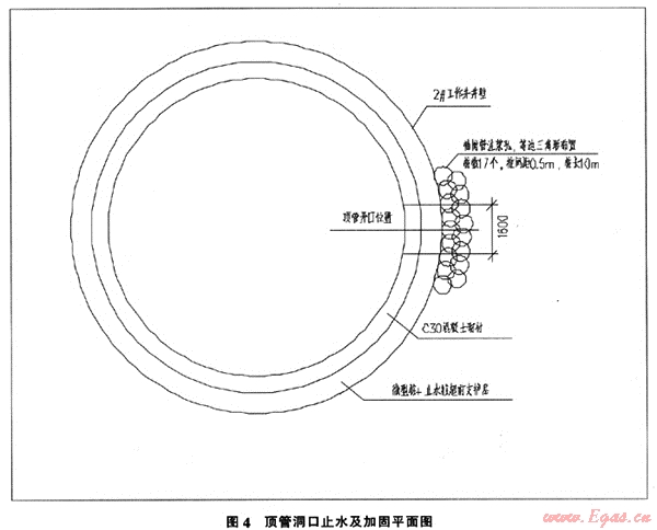 工作難點:由于頂管洞口開口部位位于細砂層中,若直接在井壁開口將會有大量泥沙涌人作業(yè)井,引發(fā)地面塌陷。解決辦法:開口前。在支護結構外圍施工兩排注漿孔,共17孔,采用袖閥管注漿法加固洞口外圍砂層,止水防滲。加固結構見圖4。開口后洞口采用砌磚封門。