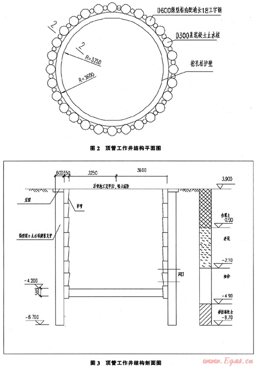 工作井樁徑D=600mm,接收井樁徑D=400mm,樁長均為12m,內置18工字鋼,通長配置。工作井沿直徑D=7.8m圓周均勻布置28根樁,接收井沿直徑D=5.1m圓周均勻布置24根樁,樁身混凝土強度:C20。