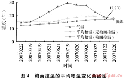 利用污氮采用如圖3所示的工藝流程進行糧面控溫,在糧倉上部空間充入污氮,然后進行噴霧增濕降溫,將倉溫控制在20℃以下。通過糧面控溫,平均糧溫的變化曲線如圖4所示。從圖可知,從8月份開始,平均糧溫超過15℃,全年的最高糧溫出現(xiàn)在11月份,達到17.2℃。由此可見,全年采用糧面控溫時,只有4個月左右的平均糧溫超過15℃,其余均控制在15℃以下,平均糧溫低于常規(guī)的無糧面控溫的糧溫。