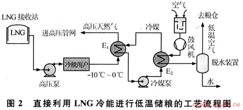 直接利用LNG的冷能來替代谷冷機生產(chǎn)冷空氣,工藝流程如圖2所示。LNG從接收站的大罐中抽出,然后經(jīng)高壓泵增壓至7.0~8.0MPa。按照“溫度對口,梯級利用”的原則,先經(jīng)保溫管線將LNG用于冷能用戶,溫度升高到0℃左右的天然氣用于低溫儲糧。在糧庫內(nèi)冷媒經(jīng)換熱器E1與天然氣換熱,天然氣溫度超過5℃后進入高壓天然氣管網(wǎng);冷媒從10℃左右降溫到5℃左右,通過冷媒泵輸送到換熱器E2中和增壓的空氣換熱,冷媒釋放出冷能后通過管線輸送回E1,空氣吸收冷媒的冷能后溫度降低,低于10℃后,經(jīng)過脫水裝置從塔底將水分離后獲得濕度適當?shù)牡蜏乜諝?,然后通入糧倉中用于糧食的通風(fēng)降溫,實現(xiàn)低溫儲糧。