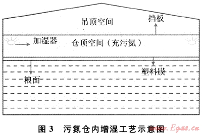 目前,我國福建、廣東、上海、河北和江蘇等地的LNG接收站均規(guī)劃建設(shè)利用LNG冷能的空分裝置,其規(guī)模均在日產(chǎn)液體空分產(chǎn)品600t左右,空氣分離過程同時副產(chǎn)了大量的污氮。從空分裝置排出的污氮含氧量在5%以下,溫度為5~10℃,幾乎不含水。假定污氮溫度為10℃,熱容為1.035kJ/(kg℃),則100t/d的污氮從10℃升高至20℃時提供的顯冷約為12.0kW。同時污氮絕對干燥,通過加水增濕可將低濕度轉(zhuǎn)化為冷量,10℃絕對干燥的污氮氣體的焓值為10.1kJ/kg,當污氮變成20℃、相對濕度80%時的焓值為50.24kJ/kg,則100t/d的污氮可提供冷能約46.5kW。因此,10℃、100t/d的污氮可以提供58.5kw的冷能,其中顯冷僅占20.5%,而干度轉(zhuǎn)化成的冷能占79.5%。污氮用于低溫儲糧主要有兩種方式:①將污氮進行霧化增濕,溫度降低,低于10℃后通入糧倉進行穿透降溫,替代谷冷機;②根據(jù)倉儲經(jīng)驗,大約有70%的熱量是通過倉房頂部傳入庫內(nèi)的,所以可將污氮充入密閉的糧倉上層空間,然后在倉內(nèi)進行霧化增濕降低污氮溫度,使倉溫保持在20℃以下,抵消掉從倉房頂部傳入的熱量,減緩平均糧溫的升高速度。其工藝流程如圖3所示。