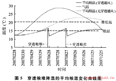 第二種方法是先將污氮采用噴霧加濕,溫度從10℃降至5.3℃,相對濕度增至29%,然后將此低溫污氮氣體進行糧堆穿透通風(fēng),平均糧溫變化曲線如圖5所示。由圖可知,無穿透降溫時倉內(nèi)平均糧溫在8月份已經(jīng)超過20℃的準低溫標準。為了實現(xiàn)低溫儲糧,當平均糧溫超過15℃時,采取污氮穿透糧堆的通風(fēng)方式進行降溫,將糧食冷卻到12℃;隨著外界環(huán)境對糧溫的影響,冷卻后的糧溫會繼續(xù)升高,當平均糧溫升高到15℃時,繼續(xù)采用穿透糧堆通風(fēng)的方式進行降溫,從而實現(xiàn)全年的低溫儲糧。