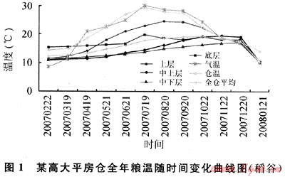 南方地區(qū)某高大平房倉(稻谷)冬季采用強制通風(fēng)降溫后全年的氣溫、倉溫和全倉糧溫變化曲線如圖1所示。
