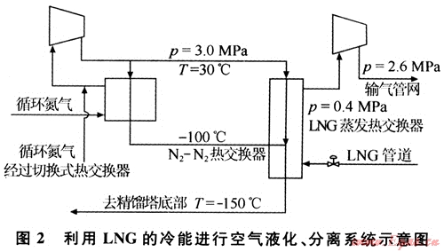 常用的空氣分離法是將空氣液化,通過氟利昂冷凍機、透平膨脹機進行空氣的液化和分離,制成液態(tài)的氮氣、氧氣、氬氣等。而LNG冷熱能用于空氣分離則是通過循環(huán)氮氣的冷卻來實現(xiàn)(見圖2)。一般來說,生產(chǎn)10×104m3的液態(tài)氣體大約需要650×104kJ的冷卻能。利用LNG的冷熱能,循環(huán)氮氣壓縮機可小型化;因不需要冷凍機,建設(shè)費用也可相應(yīng)減少;此外,LNG作為空氣分離裝置的預(yù)冷劑,生產(chǎn)液氬的空分裝置中,利用其冷能冷卻和液化由下塔抽出經(jīng)過復(fù)熱的循環(huán)氮,可以省去氟利昂制冷機以及氮透平膨脹機組,使產(chǎn)品能耗平均降低0.5kwh/m3,裝置的投資費用可減少10%左右,生產(chǎn)成本降低20%~30%。