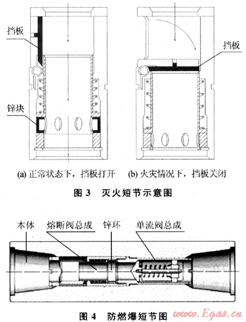 滅火短節(jié)(見圖3、圖4),即鉆柱防火接頭,這是一種低熔點合金制造的閥件,即滅火浮閥,閥內(nèi)裝有一個鋅環(huán)。在正常情況下,循環(huán)的空氣流動壓力使彈簧瓣向下張開,允許空氣循環(huán)通過。一旦環(huán)空著火,溫度上升,當超過設計溫度時,低熔點合金鋅環(huán)熔化使一個襯套封住空氣流道,關閉閥門,停止向井底循環(huán)補充空氣,從而切斷氣源使火熄滅。