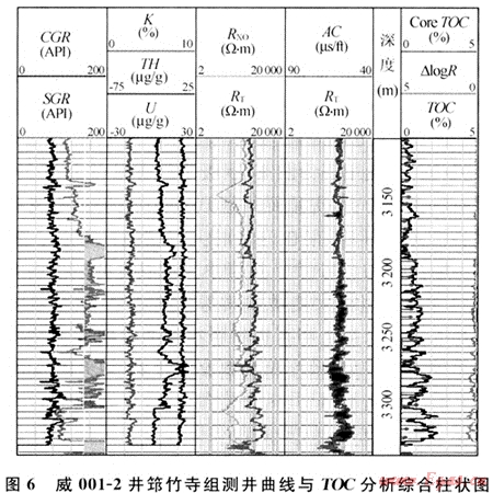 如前所述,隨深度的增加,筇竹寺組和龍馬溪組頁(yè)巖的顏色均具有自上而下逐漸加深的特點(diǎn),而其自然伽馬值和有機(jī)質(zhì)豐度也隨之逐漸增高(圖6)。威001-2是威遠(yuǎn)構(gòu)造上的一口新井,筇竹寺組的伽馬值在3175m以下明顯增加,一般都大于150API,而無(wú)論是根據(jù)測(cè)井曲線(xiàn)△㏒R(Passey,1989)計(jì)算的還是采用巖屑實(shí)測(cè)的TOC值,均顯示在該深度段以下一般都大于1.0%且逐漸增加的特征(圖6)。長(zhǎng)寧構(gòu)造上最近由中石油北京勘探開(kāi)發(fā)研究院鉆探的1口淺井也顯示出龍馬溪組頁(yè)巖所具有的上述特征。該口淺井鉆遇了龍馬溪組中下部黑色頁(yè)巖層,110m深度段以上的TOC值一般在1.5%~2.5%之間,該深度以下TOC值劇增,均大于3%,最高約9%。