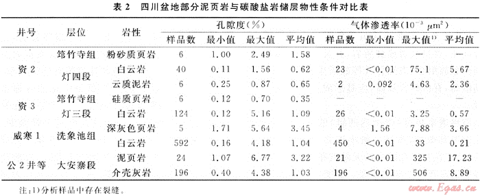 眾所周知,泥頁(yè)巖本身的孔滲性超低而致密,故一般在油氣藏的形成中起封蓋作用。但是,在四川盆地多套含油氣層系中,泥頁(yè)巖與同層的碳酸鹽巖儲(chǔ)層相比,其物性條件相差無(wú)幾(表2)。特別是在有裂縫存在的條件下,泥頁(yè)巖往往也具有較高的滲透能力,可形成·種非常規(guī)油氣層——泥頁(yè)巖裂縫性油氣層(例如侏羅系大安寨和涼高山油氣層)。在四川盆地今后的非常規(guī)油氣勘探中,理應(yīng)重視這種特殊類(lèi)型的泥頁(yè)巖儲(chǔ)集層。
