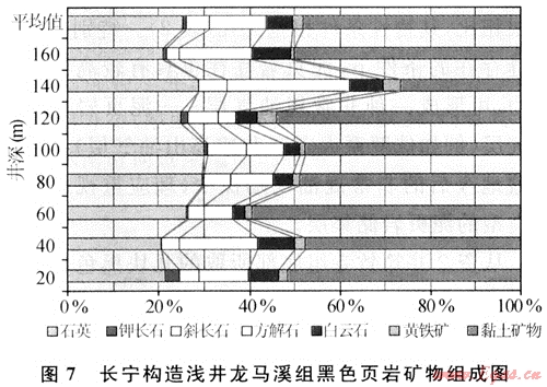 實(shí)際上,廣義的頁(yè)巖氣還應(yīng)該包括儲(chǔ)存在黑色頁(yè)巖所夾的薄層泥質(zhì)粉砂巖和各種砂巖中的天然氣。這些泥質(zhì)粉砂巖和砂巖相對(duì)純頁(yè)巖而言有較多的孔隙,因此儲(chǔ)存于其中的天然氣多為游離氣,可隨頁(yè)巖中的吸附氣一并采出。四川盆地這兩套黑色頁(yè)巖普遍含砂質(zhì),淺色石英粉砂微細(xì)紋層與暗色泥質(zhì)層交互沉積而顯水平紋理,石英分布不均,局部富集而成泥質(zhì)粉砂巖。此外,頁(yè)巖中還微含鈣質(zhì),底部多含硅質(zhì),黃鐵礦也較豐富,多呈星散狀分布。對(duì)長(zhǎng)寧構(gòu)造龍馬溪組黑色頁(yè)巖巖心樣品的礦物成分分析結(jié)果也表明,石英含量在20%~30%之間,方解石和白云石含量多在10%~25%,高者可達(dá)35%,黃鐵礦含量在1%~4%之間(圖7)。由于黑色頁(yè)巖砂質(zhì)和鈣質(zhì)較重,因此其性較脆、硬,在加砂壓裂中容易產(chǎn)生裂縫,這對(duì)于頁(yè)巖氣的開(kāi)采極為有利。