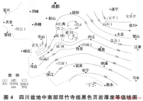 下古生界黑色頁(yè)巖集中分布在下寒武統(tǒng)筇竹寺組、下奧陶統(tǒng)大灣組和五峰組及下志留統(tǒng)龍馬溪組等4個(gè)層段中。大灣組(或大乘寺組)黑色頁(yè)巖在盆地西南部較發(fā)育,其厚度一般在45~140m,特別是在威遠(yuǎn)地區(qū)分布穩(wěn)定,也是未來(lái)下古生界頁(yè)巖氣勘探值得重視的一套目的層。五峰組黑色頁(yè)巖雖分布穩(wěn)定,但厚度較薄,一般只有幾米,且與龍馬溪組整合接觸,特征類(lèi)似。限于資料,筆者僅針對(duì)筇竹寺組和龍馬溪組兩套黑色頁(yè)巖開(kāi)展分析與討論。