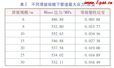 計算滑坡規(guī)模分別為6m、8m、10m、15m、20m、25m和30m工況下管道的最大Mises應力和最大等效塑性應變(見表2),隨著滑坡規(guī)模的不斷擴大,管道沿滑坡體滑動方向的應力、應變逐漸增加,當滑坡規(guī)模達到一定程度后,管道的應力、應變趨于穩(wěn)定并開始降低。該現(xiàn)象可以解釋當滑坡規(guī)模較大時,管道的彎曲程度減緩,使得彎曲應力降低,一定程度上減小了組合應力。