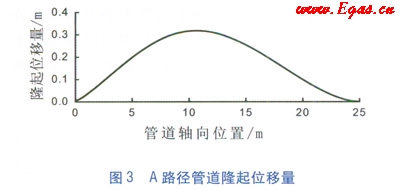 A路徑上各點的垂直方向隆起位移量見圖3(其中A點為坐標原點,C點位于管道軸向位置25m處),可見管道受滑坡體作用發(fā)生隆起,且最大隆起位移位于管道中下部,即B點偏下位置,這是因為管道下方受到的土體壓力比上方大引起的。